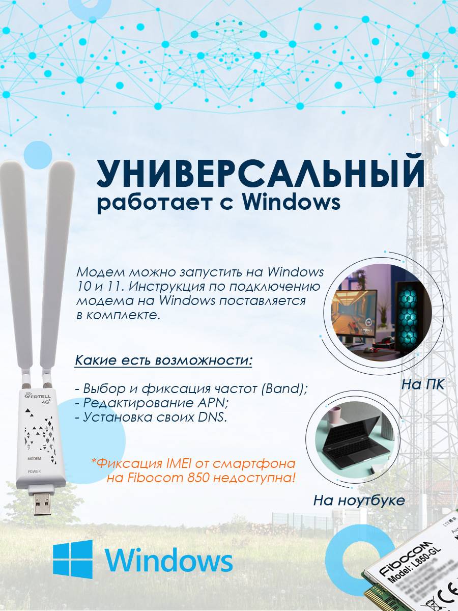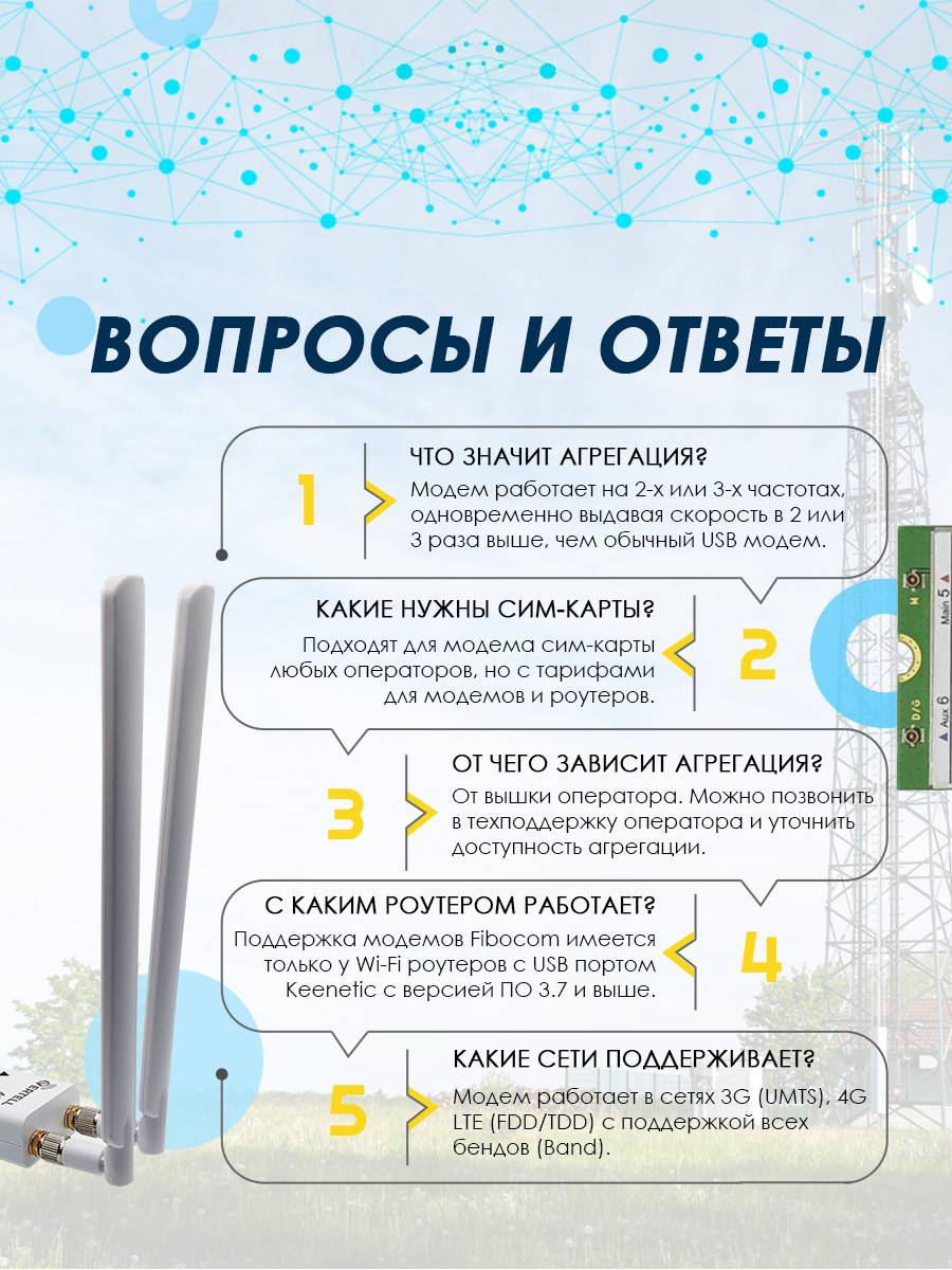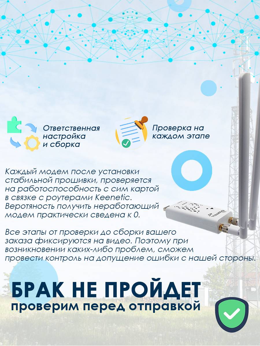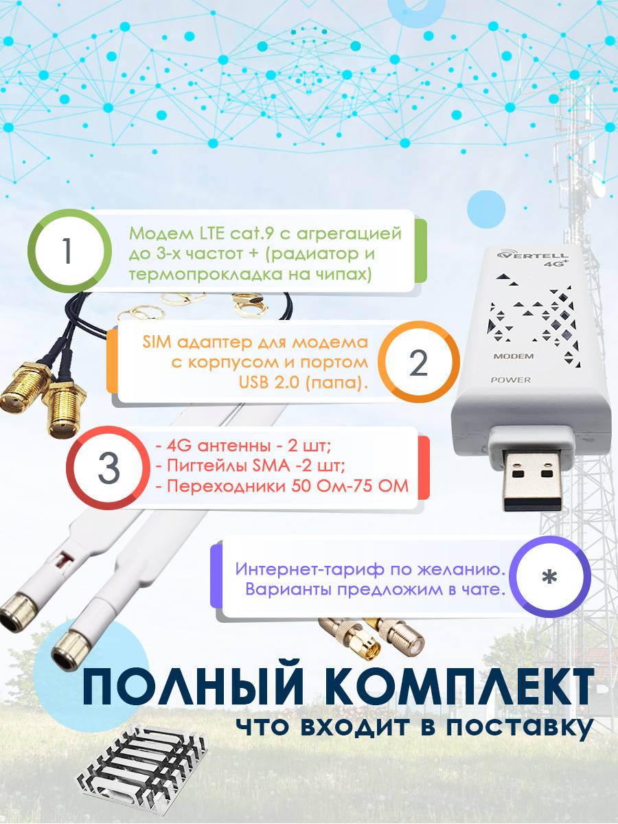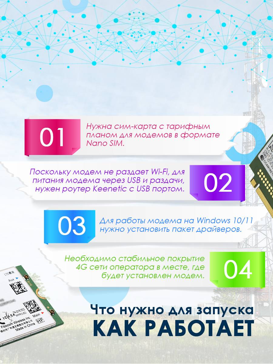 Модем прошит для комфортной работы совместно с wi-fi роутерами Keenetic (4G, Extra, Viva) с версией ПО от 3.7 и более новой. Модем также работает и с wi-fi роутером ZBT 1602 (с прошивкой Zyxel Keenetic Omni II), а также со встраиваемыми роутерами VT-STREET-M.2 или Mikrotik. Модем работает только с тарифами предназначенными для любого телекоммуникационного оборудования, т.е. для модемов, планшетов, роутеров и других устройств. Смарт тарифы не поддерживаются!