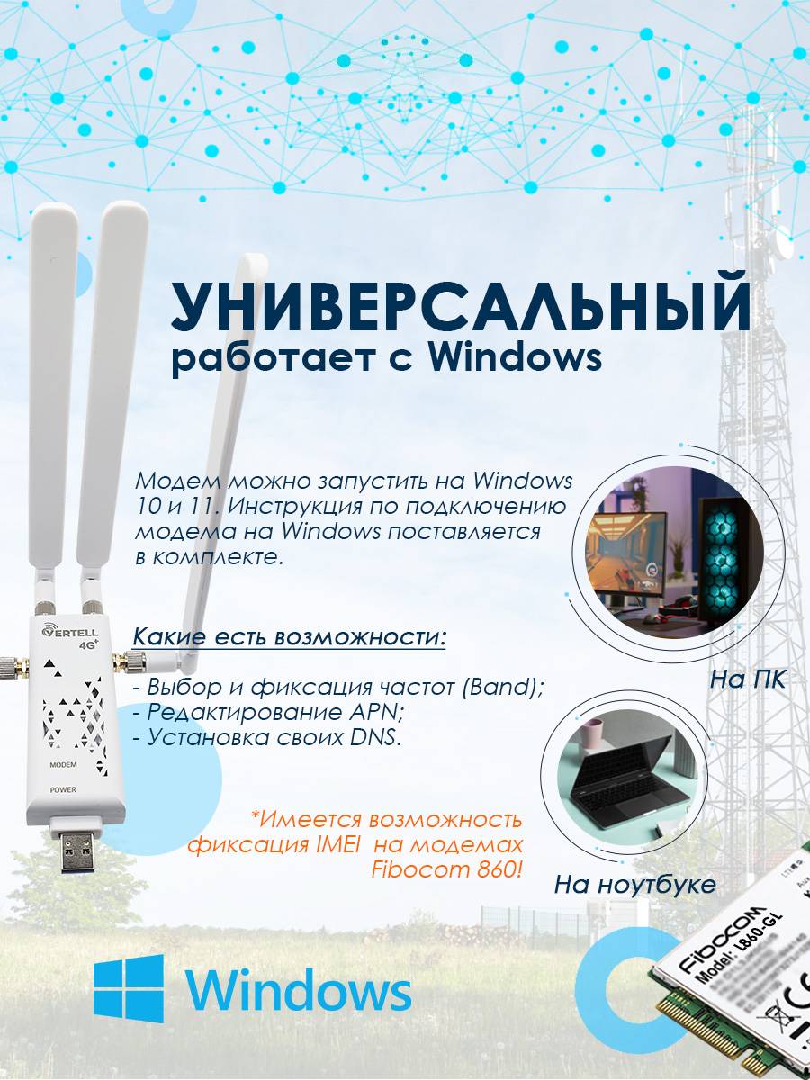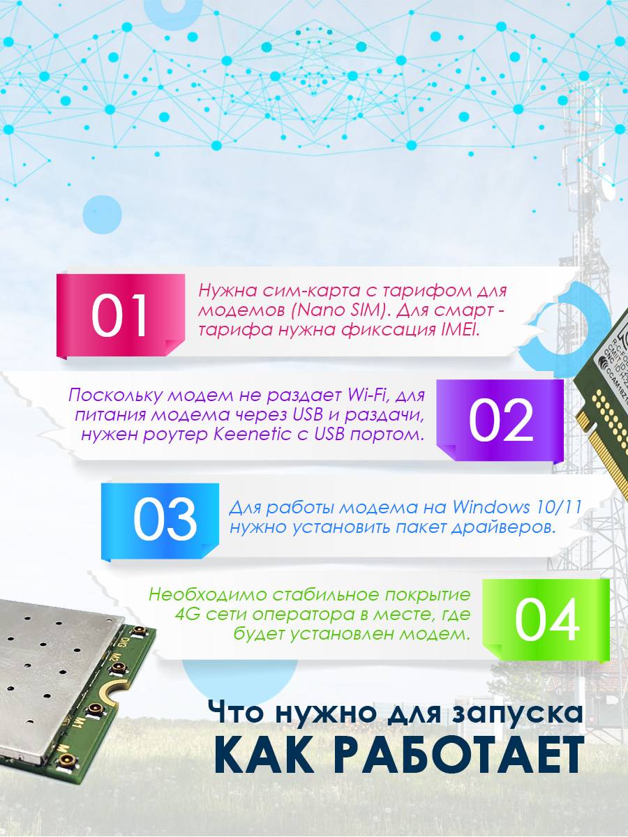 Модем прошит для комфортной работы совместно с wi-fi роутерами Keenetic (4G, Extra, Viva) с версией ПО от 3.7 и более новой. Модем также работает и с wi-fi роутером ZBT 1602 (с прошивкой Zyxel Keenetic Omni II), а также со встраиваемыми роутерами VT-STREET-M.2 или Mikrotik. На данном модеме имеется возможность фиксации IMEI от смартфона, что позволяет пользоваться не только тарифами предназначенными для любого телекоммуникационного оборудования, т.е. для модемов, планшетов, роутеров, но также и смарт-тарифами.