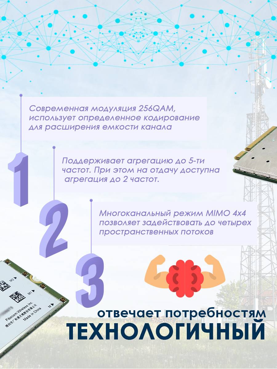 Fibocom — высокоскоростной модуль LTE Cat16 на платформе Intel7360 с интерфейсом M.2, который поддерживает все доступные стандарты связи в России, такие как LTE FDD, LTE TDD, WCDMA и многие другие. Максимальная скорость передачи данных – до 1000 Мбит/с. Имеет возможность работать в режиме 4х4 MIMO и поддерживает агрегацию частот до 5 на вход и до 2 на исходящие, за счет чего и достигается высокая скорость мобильного интернета.